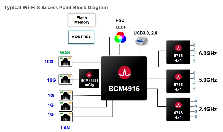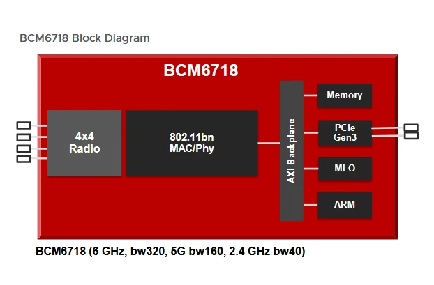 2022年にWi-Fi 7チップセットが初めて発表された際にはアクセスポイント向けSoCのBCM4916/BCM49428も同時に発表されていましたが、今回は無線インターフェースのみでSoCは発表されていません。BCM6718のProduct BriefにはBCM6718をBCM4916に接続したブロックダイアグラムが掲載されており、少なくとも個人向けアクセスポイントのSoCはしばらくの間BCM4916が最上位モデルのままになると思われます。