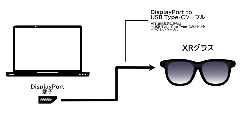 PCや家庭用ゲーム機(PlayStation 5・Xbox Series X|S・Nintendo Switchのドック)などが備えるHDMI端子からの信号を直接XRグラスに入力することはできないため、メーカー純正品もしくはサードパーティ製のアダプタでHDMIからDP Alt Modeへの変換を行う必要があります。