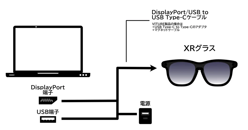 VITURE/XREAL/RayNeo/Rokidなどのブランドから発売されているメガネ型デバイス(XRグラス/ARグラス)を他の機器と繋いで映像を表示するための方法を機器別にまとめています。