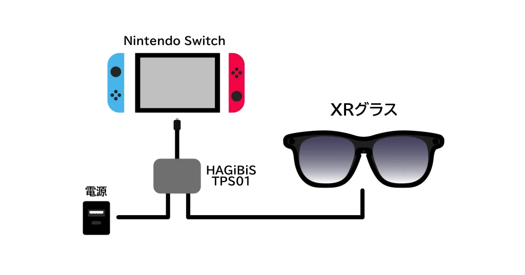 また、TPS01はNintendo Switchからの出力にも対応しており、上図のように接続することでNintendo SwitchのゲームをXRグラスでプレイ可能です。