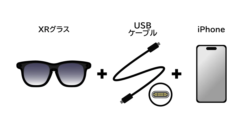 USB Type-C端子を採用したiPhone 15以降のモデルはDP Alt Modeに対応しているため、XRグラスとiPhoneをケーブルで接続するだけで映像出力が可能です。電力はiPhoneのバッテリーから供給されます。