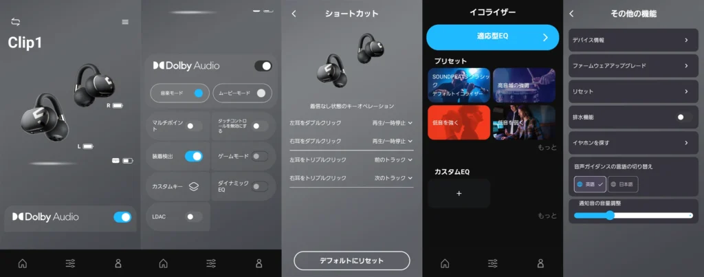 CC(PearlClip Pro)・UU(POP Clip)とClip1のイヤーカフ3機種でダイナミックEQを有効にして同じ音源を再生した限りでは、DynamicEQ Proと12mmドライバーの恩恵によるものか、Clip1が最も低音が強く出ていると感じられました。