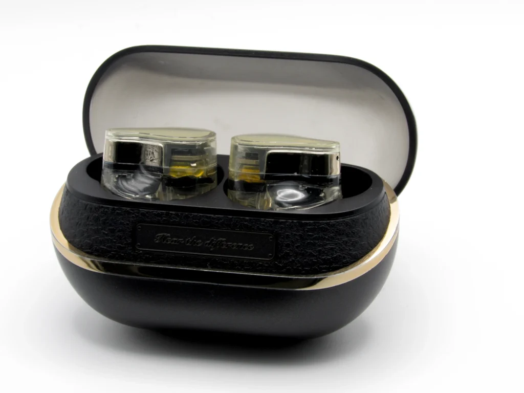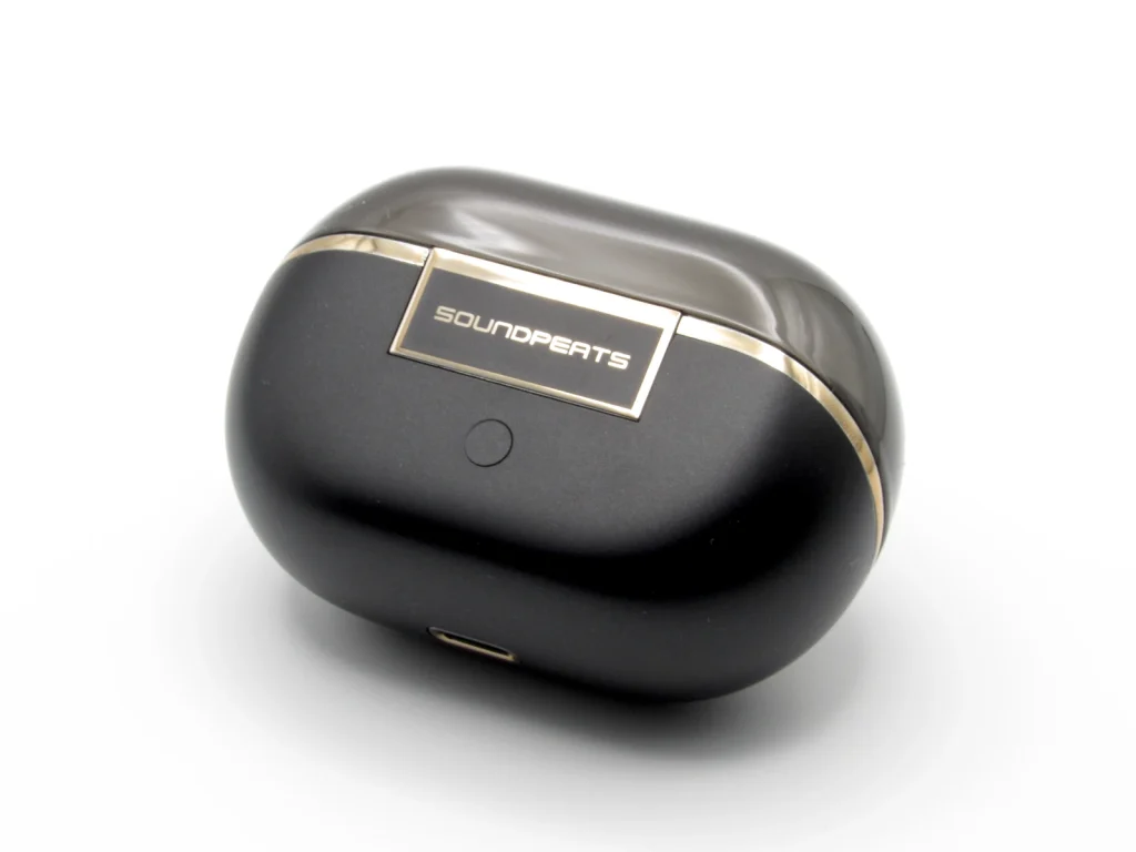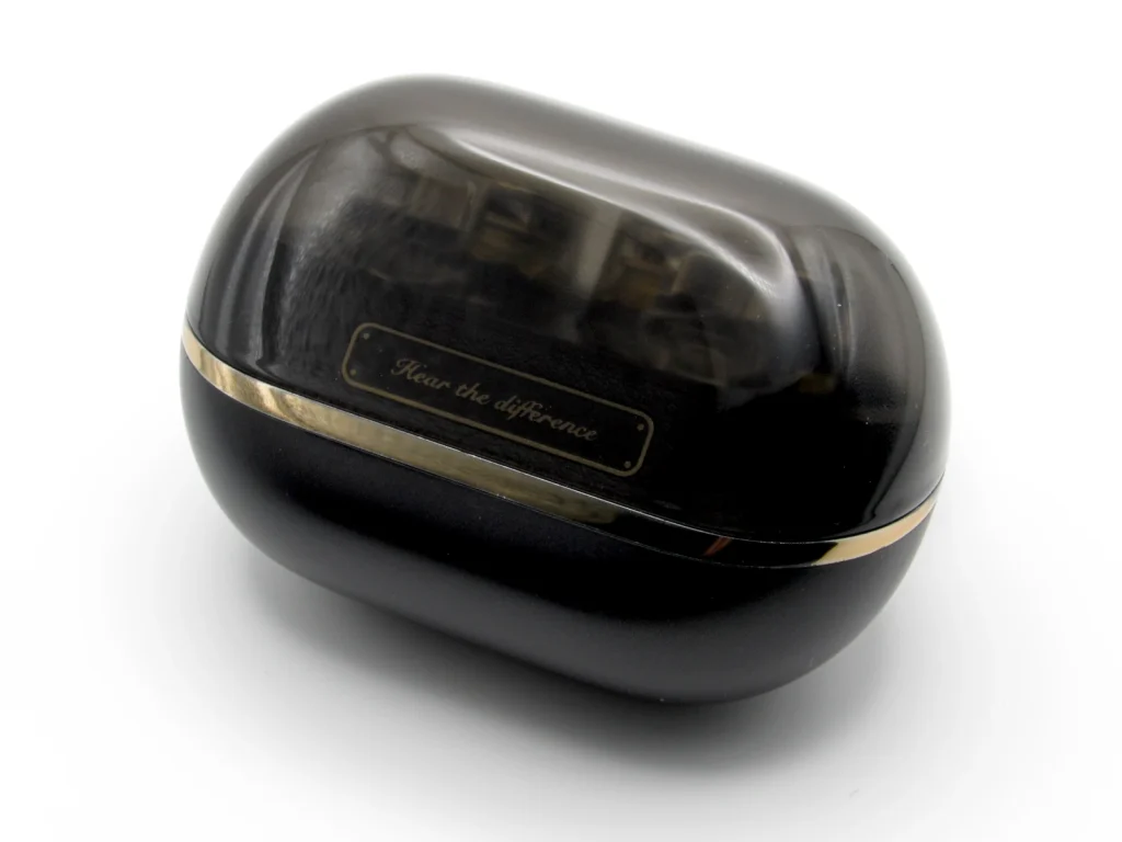 イヤホン本体と同じくケースも蓋部分が半透明であり内部に収納したイヤホンがやや透けて見えるほか、イヤホン収納部の前面に施されたレザー調の加工と金縁のプレートが高級感を醸し出しています。