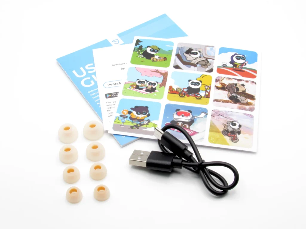 イヤーピースは本体に装着済みのものと合わせて5サイズが付属しており、耳の形状に合わせて最適なものを選ぶことができます。イヤーピースのほかにはドキュメント類とステッカー、充電用のUSB Standard-A to Type-Cケーブルが付属しています。