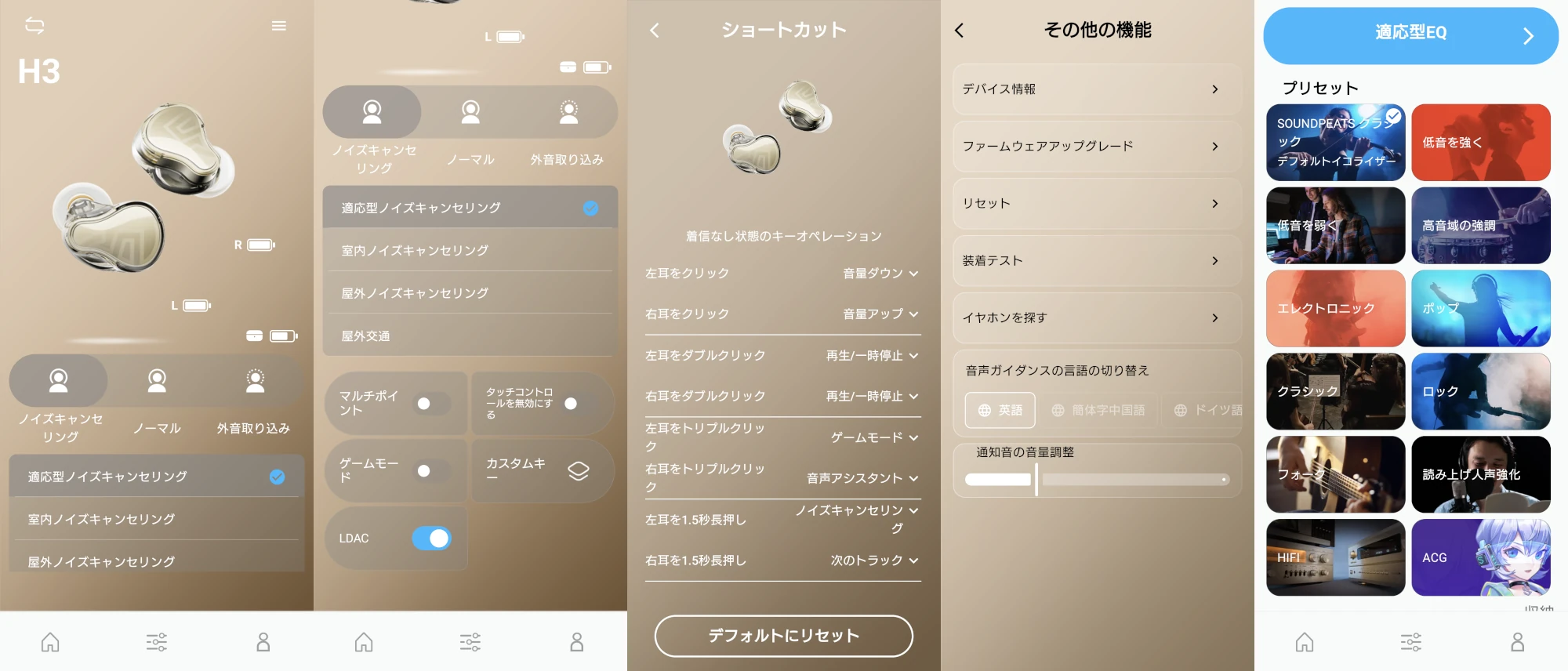 従来のSOUNDPEATS製品と同じくAndroid/iOS向けアプリ「PeatsAudio」に対応しており、アプリからH3の設定変更やイコライザのカスタマイズが行えます。複数台の機器との接続を可能にするマルチポイント機能はLDACと排他であり、PeatsAudio上で切替可能です。